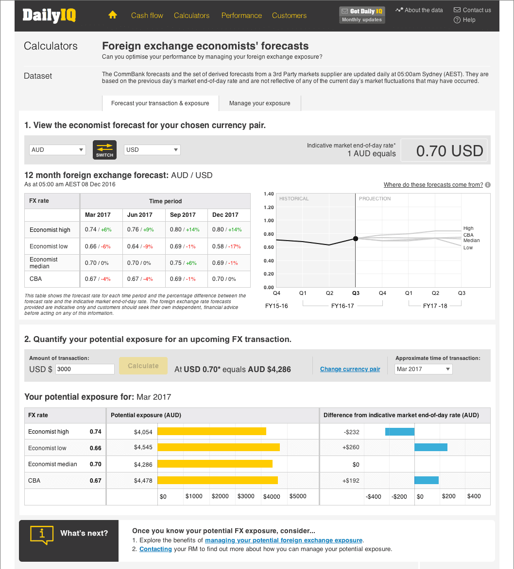 This calculator was a new tool that I designed during my time with the team, and it was definitely the most complex tool in the toolkit, requiring plenty of research and sessions with CBA experts to understand the world of FX markets, forecasting and hedging.