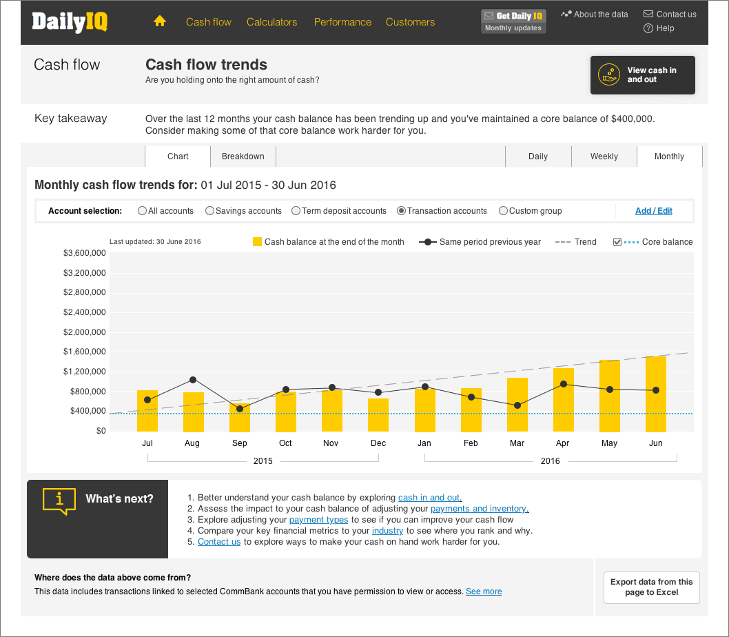 Driving Cross-Sell ("What's Next?"): I collaborated with CBA relationship managers to design a "What’s next?" section. This provided users with clear, actionable steps based on their data, effectively cross-selling other Daily IQ tools. This feature was so successful it was rolled out across the entire toolkit.